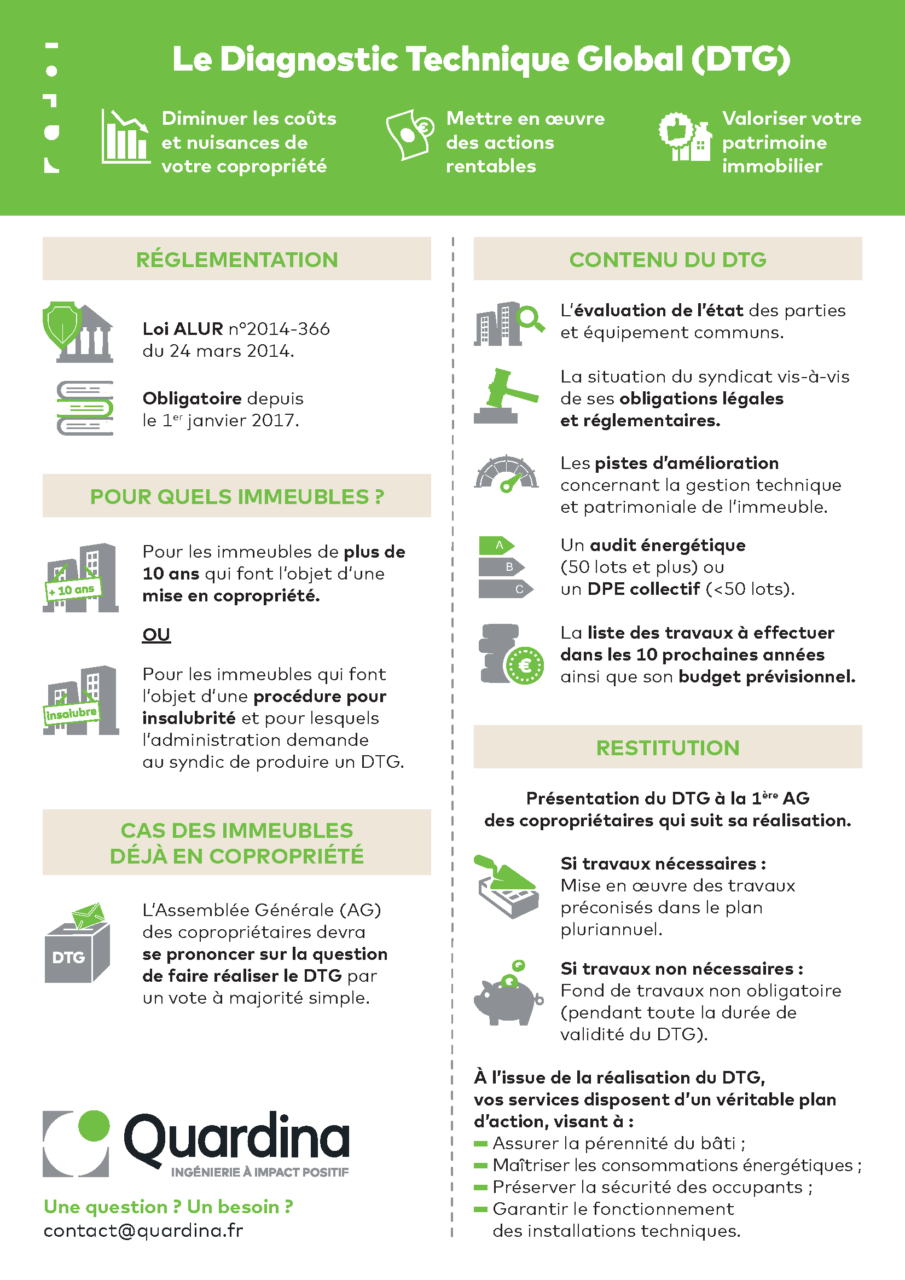 Pour les immeubles de plus de 10 ans qui font l’objet d’une mise en copropriété. OU Pour les immeubles qui font l’objet d’une procédure pour insalubrité et pour lesquels l’administration demande au syndic de produire un DTG.